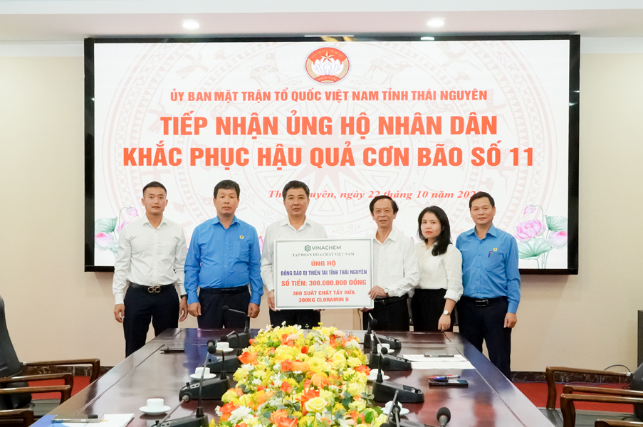 Tại Ủy ban Mặt trận Tổ quốc Việt Nam tỉnh Thái Nguyên, đoàn công tác đã trao tặng 300 triệu đồng tiền mặt, 300 kg Cloramin B (hóa chất diệt khuẩn bề mặt và xử lý nước) cùng 300 suất sản phẩm tiêu dùng thiết yếu (bột giặt, nước rửa chén...) là sản phẩm do các đơn vị thành viên Tập đoàn sản xuất.