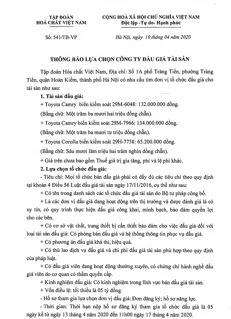 Thông báo lựa chọn công ty đấu giá tài sản
