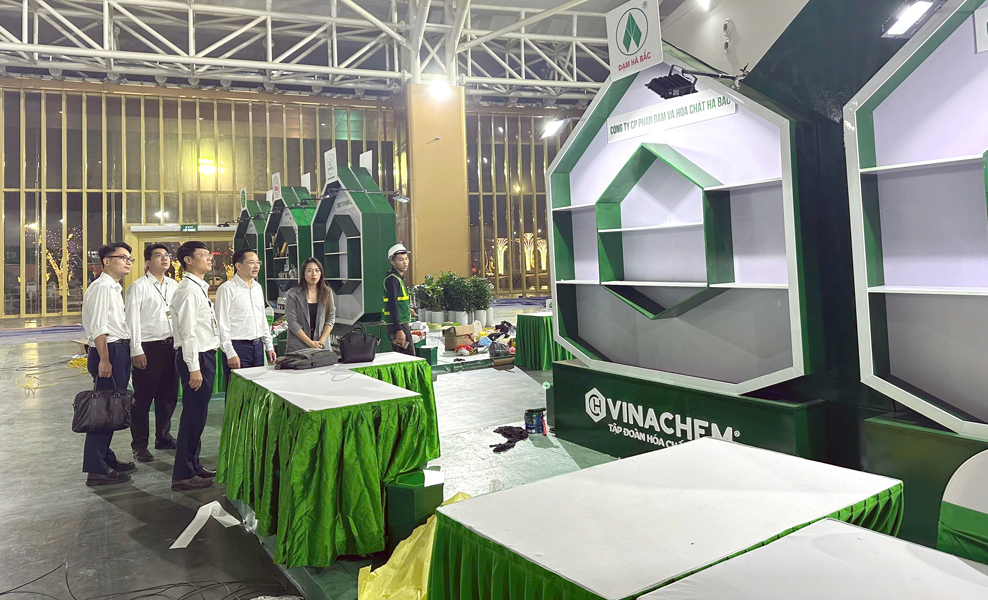 Tại buổi kiểm tra, Tổng Giám đốc Nguyễn Hữu Tú đã đến thăm từng khu trưng bày, lắng nghe báo cáo của các đơn vị về ý tưởng thiết kế, bố trí không gian và danh mục sản phẩm giới thiệu. Gian hàng của VINACHEM được thiết kế hiện đại, với điểm nhấn là không gian trung tâm giới thiệu tổng thể Tập đoàn, cùng các khu trưng bày riêng của từng đơn vị thành viên.