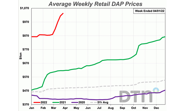 Theo DTN, giá trung bình 8 loại phân bón trong tuần kết thúc vào ngày 1/4 đều tăng so với tuần trước đó. Ure dẫn đầu danh sách với mức tăng 46 USD so với tuần trước đó lên 1.022 USD/tấn, tương đương với mức tăng 5%. Tiếp đó là MAP, UAN28 cùng mức tăng 2,4% lên 1.045 USD/tấn và 637 USD/tấn.