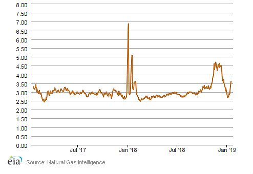 Giá khi tự nhiên giao tháng 2 trên sàn giao dịch bán buôn New York tăng 49,2 US cent hay 15,9% đóng cửa tại 3,591 USD/mmBtu, cao nhất khi đóng cửa kể từ ngày 27/12/2018. Phiên vừa qua có mức tăng theo phần trăm mạnh nhất trong 8 tuần, và mạnh thứ hai kể từ năm 2010. Đây là phiên thứ hai hợp đồng này tăng hơn 5% kể từ đầu năm nay. Trong hai tháng cuối năm 2018, hợp đồng này đã tăng hay giảm hơn 5% trong 27 lần.