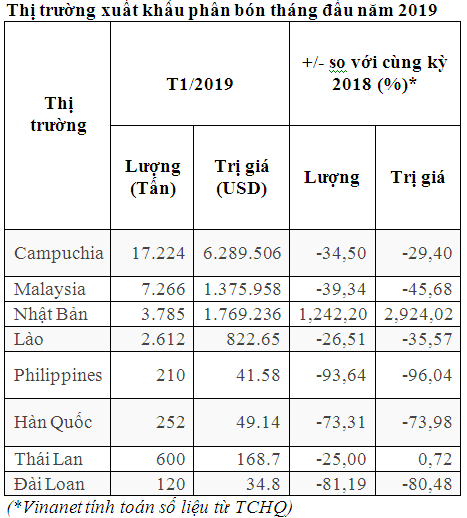 Nối tiếp đà sụt giảm từ tháng cuối tháng năm 2018, những tháng đầu năm 2019xuất khẩu phân bón sụt giảm cả lượng và trị giá. Trong số thị trường nhập khẩu phân bón từ Việt Nam, thì xuất sang Nhật Bản tăng đột biến.