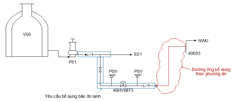 - Cải tạo đấu nối đoạn ống từ cửa ra bơm P51 vào đường ống cấp Nitơ lỏng sang hộp lạnh Tinh Chế có sẵn trên giàn ống. Thiết kế thêm van tay cách ly trên đường ống từ bơm P51 vào thiết bị gia nhiệt và trên đường ống từ bơm P51 vào đường ống cấp Nitơ lỏng. Khống chế áp suất cửa ra bơm P51 bằng van PV8654.