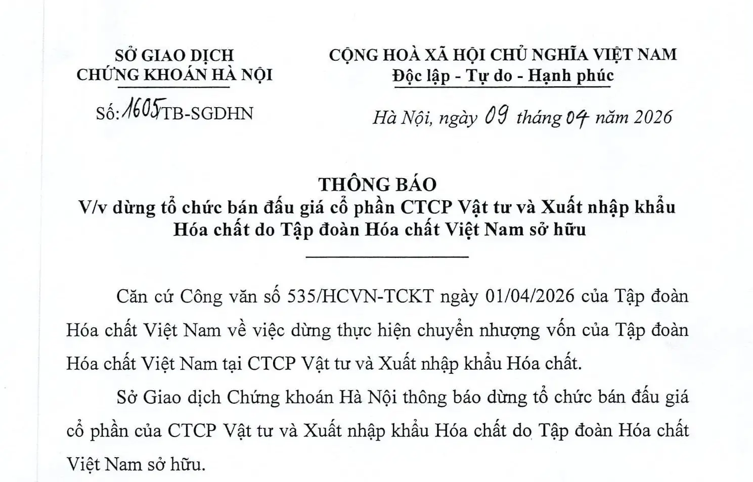 Ngày 09 tháng 04 năm 2026, Sở Giao dịch Chứng khoán Hà Nội thông báo số 1605/TB-SGDHN về việc dừng tổ chức bán đấu giá cổ phần của CTCP Vật tư và Xuất nhập khẩu Hóa chất do Tập đoàn Hóa chất Việt Nam sở hữu.XEM TIẾP04:24 CH @ 19/01/2026