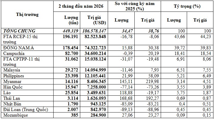 Tính chung 2 tháng đầu năm 2026, xuất khẩu phân bón đạt gần 449.319 tấn, trị giá 186,58 triệu USD, giá trung bình 415,3 USD/tấn, tăng 34,5% về lượng, tăng 38,8% về kim ngạch và tăng 3,2% về giá so với 2 tháng đầu năm 2025.